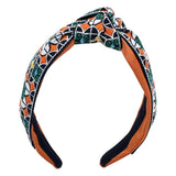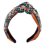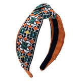 This eye-catching turban features a center knot emphasis and is crafted from vibrant brocade vintage ribbon, showcasing a rich tapestry of colors and patterns. The unique fabric adds a touch of luxury and nostalgia, making it a standout accessory for any occasion. Perfect for adding a bold statement to your outfit, this turban combines retro charm with modern style, elevating your look effortlessly.