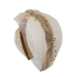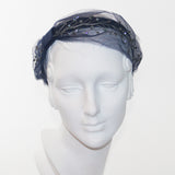 This rhinestone turban styled headpiece feature delicate tulle fabric adorned with shimmering rhinestones, resulting in a captivating and elegant design that exudes sophistication and charm reminiscent of a old Hollywood film.