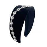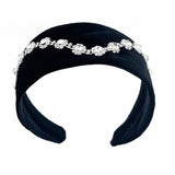 Our latest rhinestone look is an elegant velvet wide headband with scalloped rhinestone flower trim. Inspired by the iconic style of Old Hollywood starlets, our headpiece features sumptuous velvet adorned with dazzling rhinestones. The plush velvet adds a touch of richness and texture, while the rhinestones bring a sparkling brilliance that captures the light with every movement. With its vintage-inspired design, our headpiece evokes the grandeur and romance of Old Hollywood, transporting you to a time of glamour and extravagance.