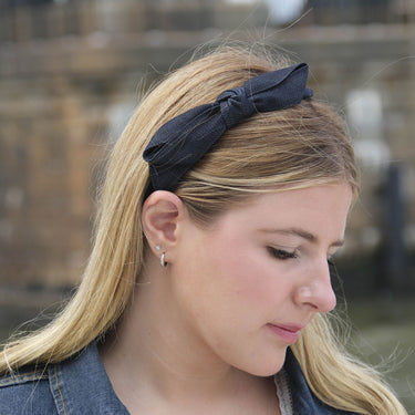 Crafted from premium denim fabric, this headband offers a contemporary twist on a classic material. What sets our Denim Headband apart is the exquisite side bow detail, created using couture sewing techniques. Our skilled artisans pay meticulous attention to every stitch, ensuring that each bow is perfectly formed and flawlessly executed, adding a touch of couture to your look.