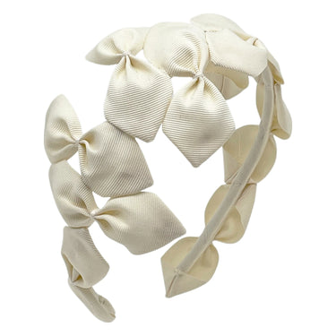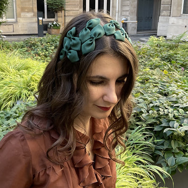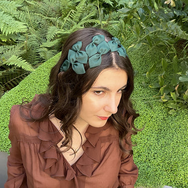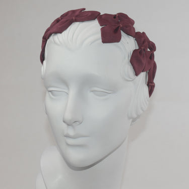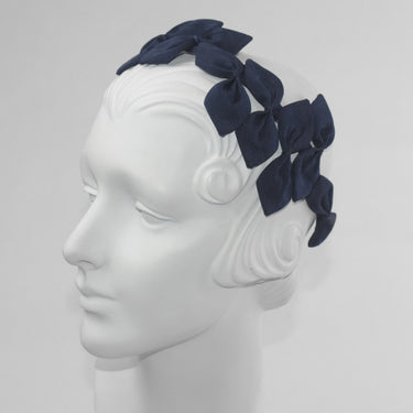 Our best selling Sabrina headpiece is made of petite grosgrain ribbon bows. Inspired by 1950s style, this small work of art is absolutely fetching! Couture sewing techniques are used to prepare and sew the bows into their little hat formation. This shape fits close to the head and is easy to wear not matter what your hair style. Sabrina is named after the film starring Audrey Hepburn called "Sabrina". Wear this style anywhere Audrey would!
