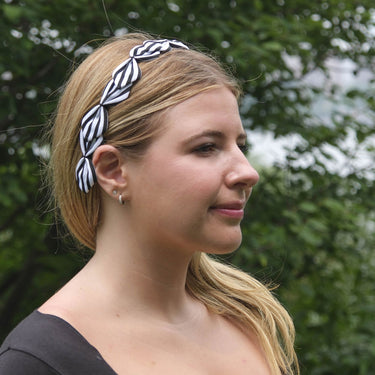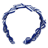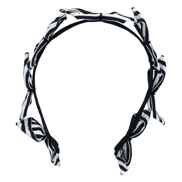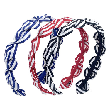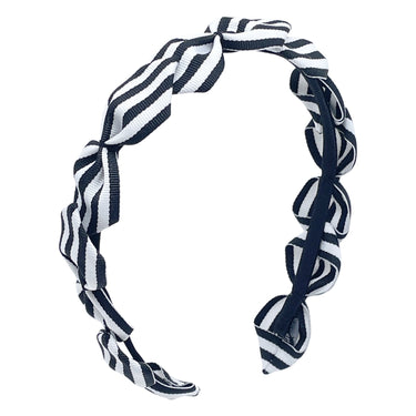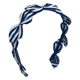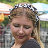 Our Stripe Gabriela Headband embodies casual chic with its striped grosgrain ribbon bows set on a sleek narrow headband. This timeless silhouette combines comfort with style, featuring an artful arrangement of bows that adds a playful touch. Versatile in design, it can be worn with the bows positioned upright or laid flat, allowing you to customize your look to match your mood. A testament to our commitment to innovation and classic millinery charm, this headband offers subtle elegance and timeless appeal.