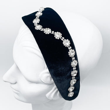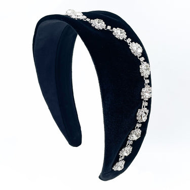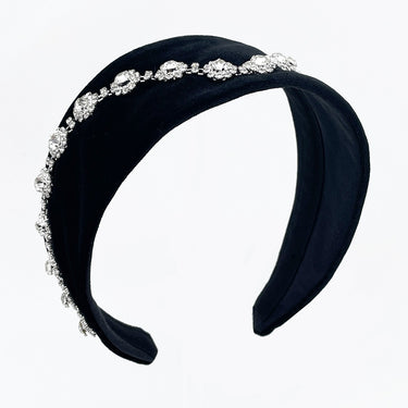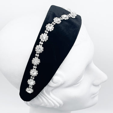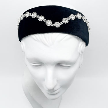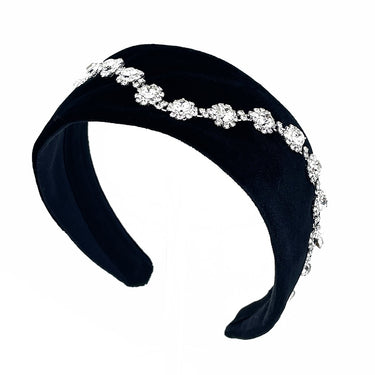 Our latest rhinestone look is an elegant velvet wide headband with scalloped rhinestone flower trim. Inspired by the iconic style of Old Hollywood starlets, our headpiece features sumptuous velvet adorned with dazzling rhinestones. The plush velvet adds a touch of richness and texture, while the rhinestones bring a sparkling brilliance that captures the light with every movement. With its vintage-inspired design, our headpiece evokes the grandeur and romance of Old Hollywood, transporting you to a time of glamour and extravagance.
