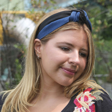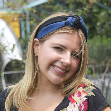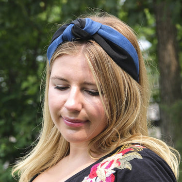 If you own only one headband, this should be it! Our Blue Jean and Black Blair turban is favorite for years of Jennifer Ouellette clients. The Blair turban is named after Blair Waldorf - the Beloved '90s Fashionista! Indulge in our Two Tone Blair Turban Headband, where classic denim meets refined grosgrain for a stylish twist on a timeless accessory. This headband effortlessly blends casual charm with understated elegance.