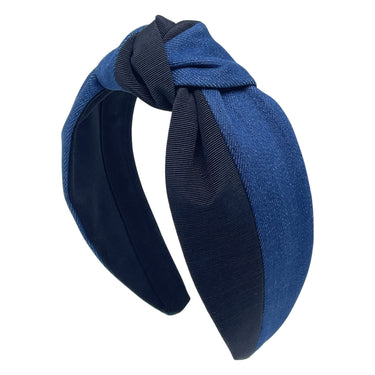 The contrasting combination of denim and grosgrain fabric adds a touch of sophistication to your look, making it the perfect accessory for both casual outings and special occasions. Our skilled artisans carefully select and pair these materials to create a headband that exudes effortless style and versatility.
