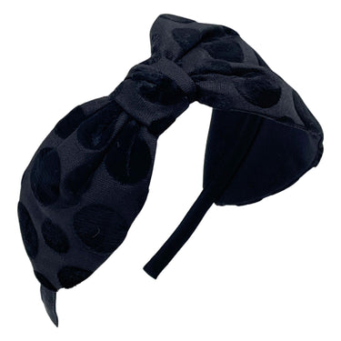 The Dotted Audrey Bow Headpiece is a petite hat alternative, crafted from vintage-styled big velvet dot fabric. Inspired by Audrey Hepburn's timeless elegance, this headpiece combines classic charm with a playful touch. Its delicate design adds a sophisticated flair to any outfit, making it ideal for special occasions or elevating everyday looks. Embrace a touch of vintage glamour with this beautifully crafted accessory.