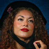 This winter hat, inspired by the elegance of Scarlett O'Hara, is a luxurious piece crafted from European velour felt. It features long velvet ribbons that can be stylishly tied under the chin or behind the neck, adding versatility to its sophisticated design. Trimmed with vintage velvet birds, it offers a timeless and enchanting touch. Ideal for your winter style, this statement piece is a beautiful choice for weddings and the holiday season, blending classic charm with modern flair.
